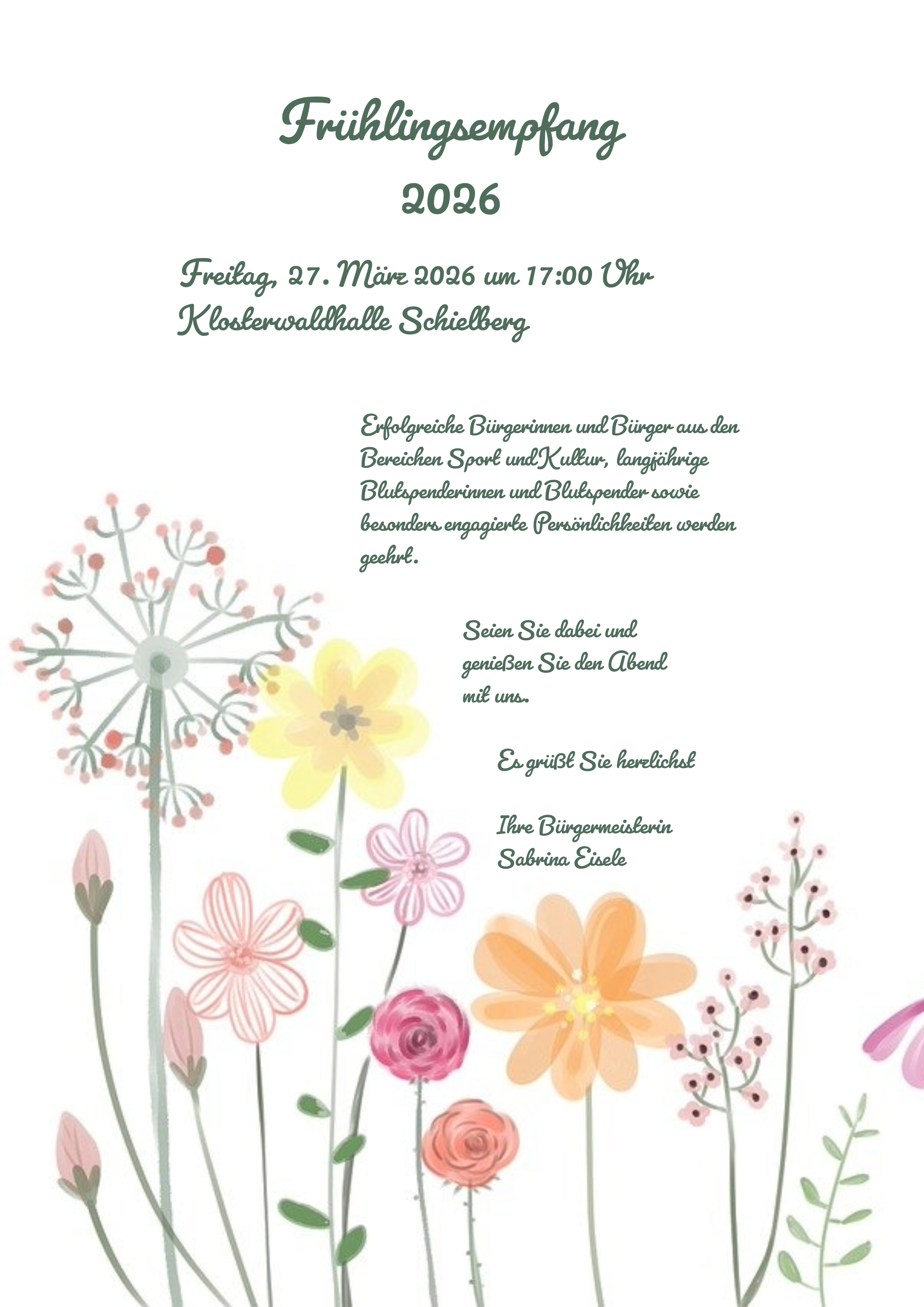 Herzliche Einladung zum Frühlingsempfang am 27. März 2026 um 17:00 Uhr in der Klosterwaldhalle, Schielberg