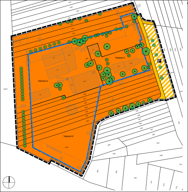 Der Geltungsbereich umfasst die Flurstücke 1231, 1232, 1233, 1234, 1245, 1246, 1247, 1248, 1249, 1250, 1251, 1252, 1253/1, 1336 und Teile der Flurstücke 1334, 1337, 1254.